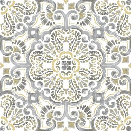 Grey and yellow Moroccan-inspired peel and stick floor tile