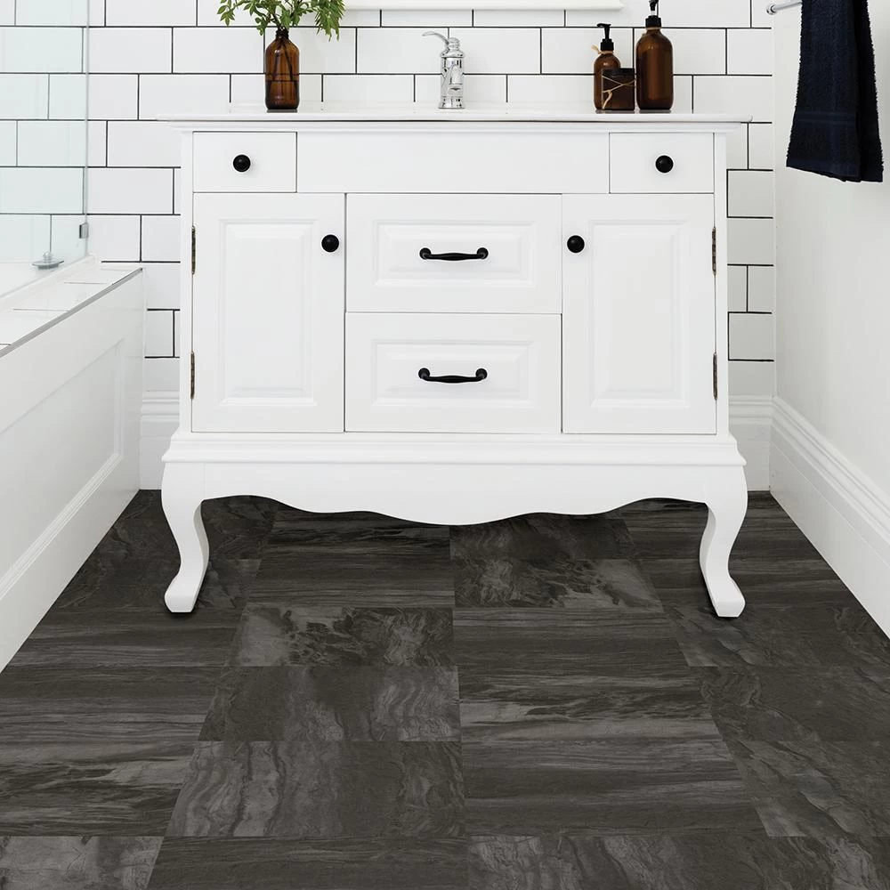 With a marble inspired design, these peel and stick floor tiles exude a polished energy. Its dark grey hues lend to a moody vibe perfect for making a bold statement. Raven Peel and Stick Floor Tiles Set contains 20 pieces on 20 sheets that each measure 12 in. x 12 in.