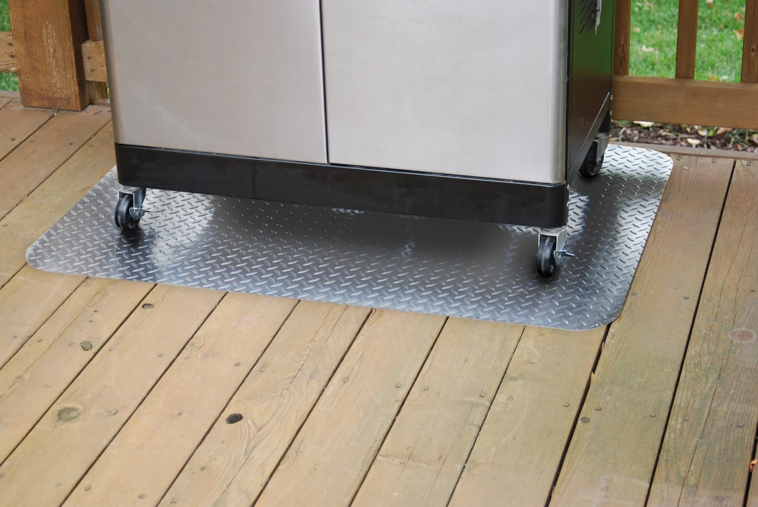Protect your deck or patio with this G-Floor Grill Mat in Metallic Silver. It will protect surfaces from hot grease, oily spills and other stains. This grill mat is flame resistant and has a non-porous surface for easy clean up. Designed to withstand grill heat while protecting wood decking and concrete patios. It holds up to all types of weather, but can easily be rolled up for storage when not in use. The Metallic Silver color and attractive Diamond Tread pattern are sure to complement your grilling area. This mat will keep your area clean, protected and looking great. Not for use with composite decks.