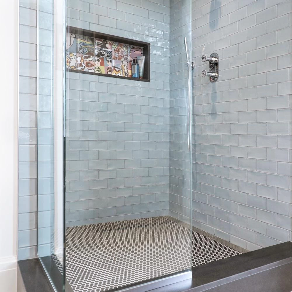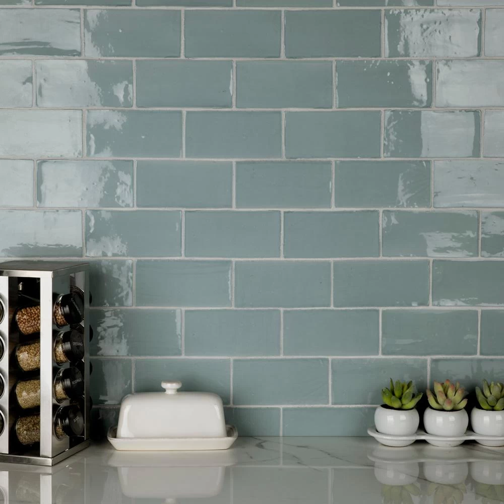 The Merola Tile Chester Acqua 3 in. x 6 in. Ceramic Wall Subway Tile has a unique handmade look. The glossy aqua glaze recalls a watercolor finish and accents natural variations in the surface of each piece. This versatile look is great for any wall and the soft color creates a soothing atmosphere in any space.