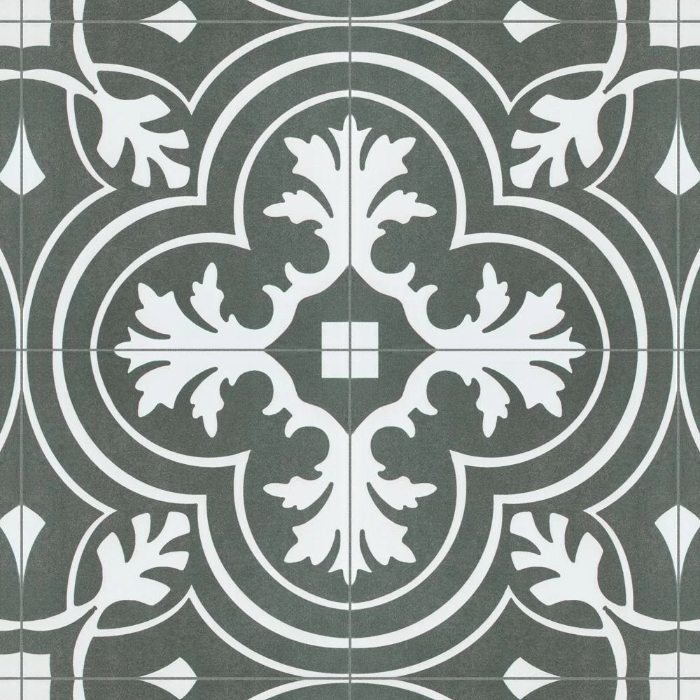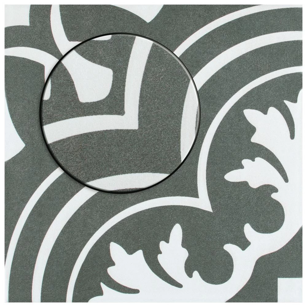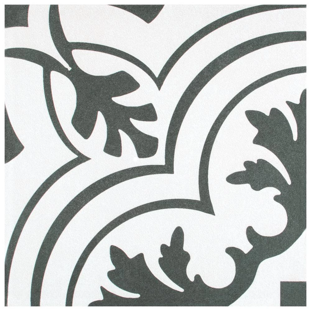 Drawing inspiration from artisan cement tiles, the Merola Tile Twenties Classic Encaustic 7-3/4 in. x 7-3/4 in. Ceramic Floor and Wall Tile exudes encaustic flair. Set on a speckled dark charcoal base, the off-white design features delicate grey freckles, giving this tile subtle definition. Soft, simplistic arcs frame the floral, old-world pattern and rendezvous to reflect Spanish designs. Capturing a sought after designer look, this pattern is great for bringing a custom look to your home for less. With a matte glaze, this artistic tile is an excellent choice for backsplashes, showers, foyers and exterior work. Pair this tile with the rest of the monochromatic, geometric patterned Twenties series or as a dynamic inflection for any application.