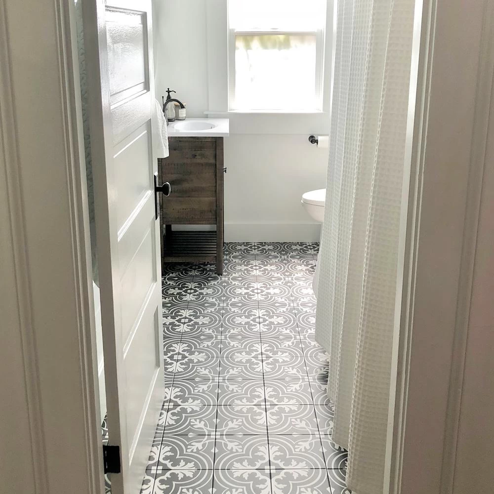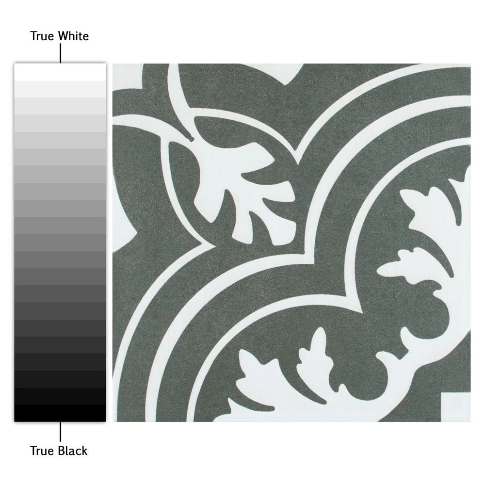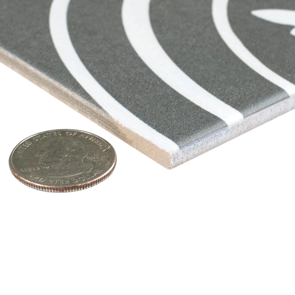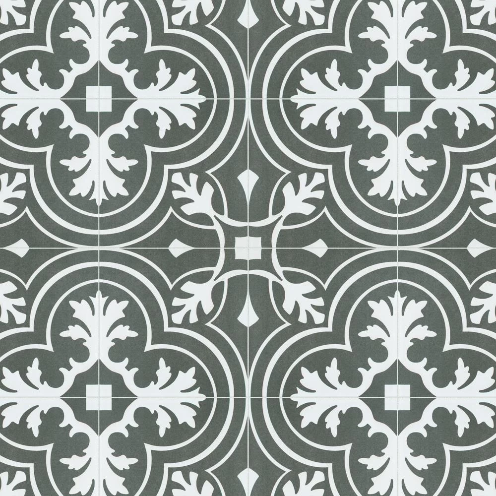Drawing inspiration from artisan cement tiles, the Merola Tile Twenties Classic Encaustic 7-3/4 in. x 7-3/4 in. Ceramic Floor and Wall Tile exudes encaustic flair. Set on a speckled dark charcoal base, the off-white design features delicate grey freckles, giving this tile subtle definition. Soft, simplistic arcs frame the floral, old-world pattern and rendezvous to reflect Spanish designs. Capturing a sought after designer look, this pattern is great for bringing a custom look to your home for less. With a matte glaze, this artistic tile is an excellent choice for backsplashes, showers, foyers and exterior work. Pair this tile with the rest of the monochromatic, geometric patterned Twenties series or as a dynamic inflection for any application.