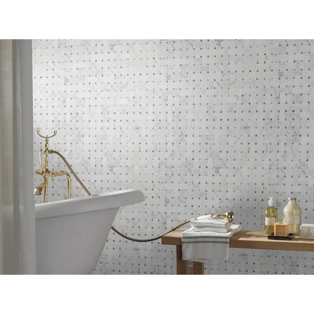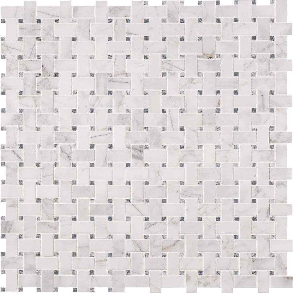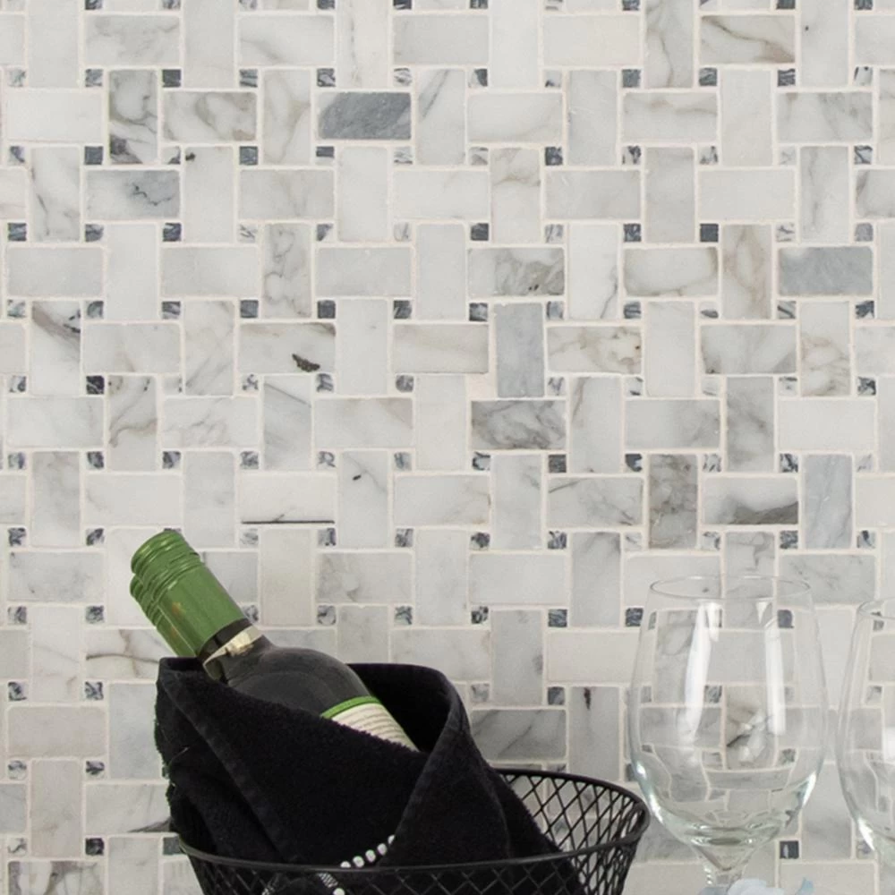 Accentuate your home with the elegance of this MSI Calacatta Cressa Basket-weave Honed Mosaic Tile. Featuring basket weave pieces of white and gray porcelain, it adds visual interest to any interior or exterior space. These mesh-backed tiles are easy to install and maintain and give you a designer look at an affordable price. The perfect choice for updating your kitchen backsplash, bath wall, countertop surface or feature wall. Designed for both residential and commercial use. Natural stone products are naturally subject to variations in color, shade, finish, etc. It is recommended to blend tiles from different boxes when installing. Natural stones may be characterized by dry seams and filled pits. The filling can work its way out and refilling these areas may be needed as part of a normal maintenance procedure. Seal all natural stone products with a penetrating sealer. Note: Inspect all tiles before installation. Natural stone products inherently lack uniformity and are subject to variation in color, shade, finish etc. It is recommended to blend tiles from different boxes when installing. Natural stones may be characterized by dry seams and pits that are often filled. The filling can work its way out and it may be necessary to refill these voids as part of a normal maintenance procedure. All natural stone products should be sealed with a penetrating sealer