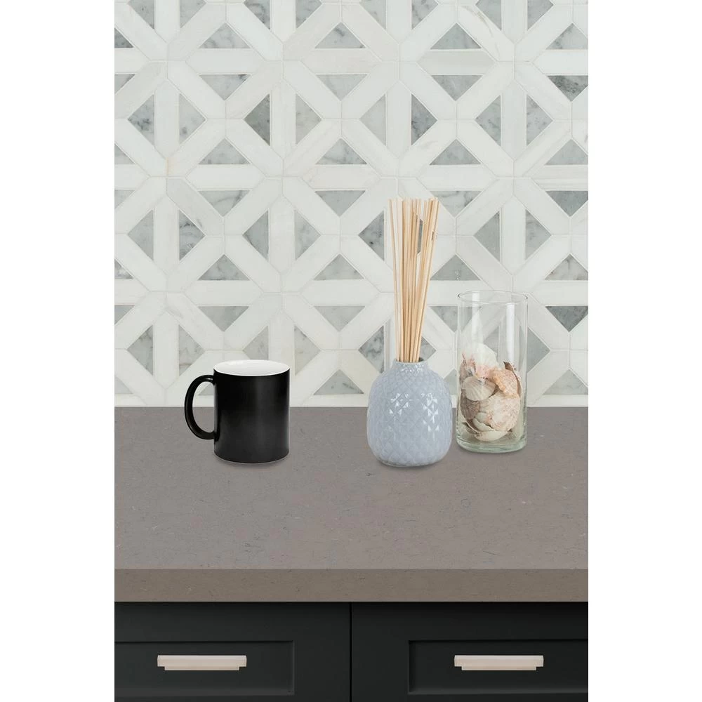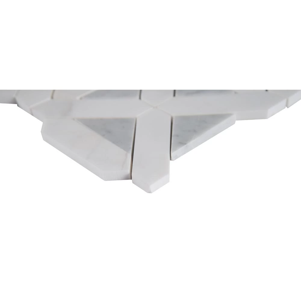 Accentuate your home with the elegance of this MSI Bianco Dolomite Geometrica Polished Patterned Mosaic Tile. Featuring Turkish marble stones with smooth grey veining, this tile adds visual interest to any interior space. It is the perfect choice for updating your kitchen backsplash, bath wall, countertop surface or feature wall. Durable and with mesh backing for easy installation, this 12 in. x 12 in. tile is designed for both residential and commercial use. Note: Inspect all tiles before installation. Natural stone products inherently lack uniformity and are subject to variation in color, shade, finish etc. It is recommended to blend tiles from different boxes when installing. Natural stones may be characterized by dry seams and pits that are often filled. The filling can work its way out and it may be necessary to refill these voids as part of a normal maintenance procedure. All natural stone products should be sealed with a penetrating sealer.