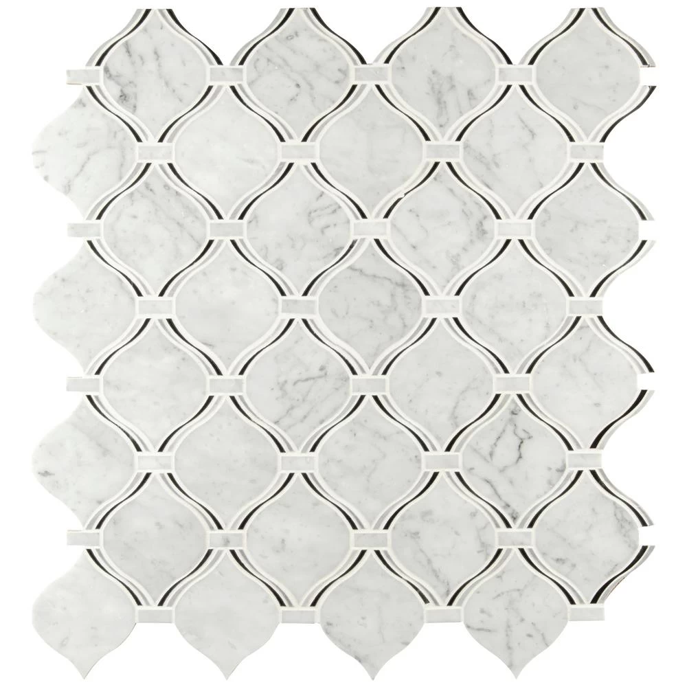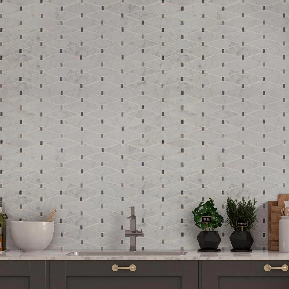 Add a splash of sophistication to your decor with Marbella Diamond Polished Marble Mosaic Wall Tile. It features unique styled pieces of polished white Italian marble, lending an upscale look and contemporary flair to any interior expanse. The high-sheen, smooth-finished genuine stone chips are perfectly arranged on a 12 in. x 12 in. mesh-backed mosaic. Suitable for residential and commercial use, this ornate tile has a distinct pattern that is certain to inject space-defining allure into any setting. Note: Inspect all tiles before installation. Natural stone products inherently lack uniformity and are subject to variation in color, shade, finish, etc. It is recommended to blend tiles from different boxes when installing. Natural stones may be characterized by dry seams and pits that are often filled. The filling can work its way out and it may be necessary to refill these voids as part of a normal maintenance procedure. All natural stone products should be sealed with a penetrating sealer.