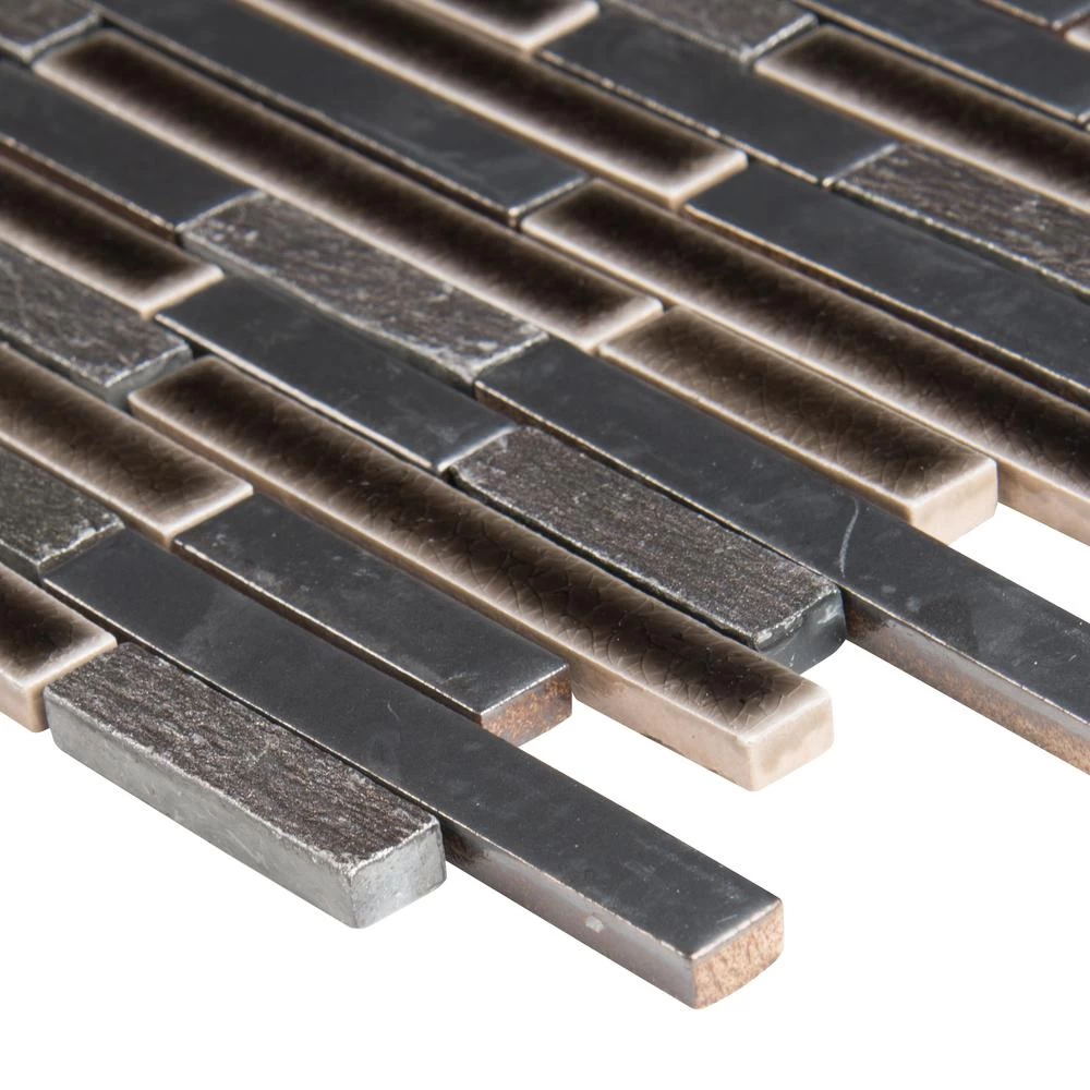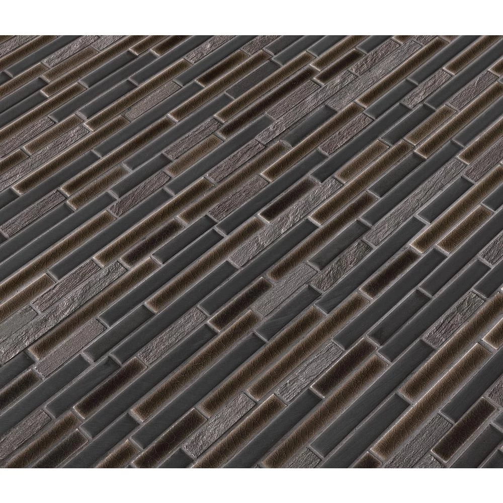 Add a splash of modern styling to your decor with Titan Interlocking Mosaic Tile. A seemingly random blend of black/gray porcelain and stone strips forms this 12 in. x 12 in. mesh-mounted tile, infusing your space with a clean look and a contemporary ambience. The mixed-sheen, mixed-finish tiles from MSI will invigorate any residential or commercial setting and are versatile enough to be used outside or on a fireplace surround. They look particularly ravishing as kitchen backsplash or bath wall and work stunningly as a countertop surface or feature wall.