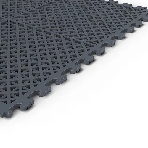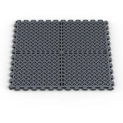 - The Norsk NSMPVN6DG interlocking PVC floor tiles are flexible, unlike other stiff plastic like flooring options. PVC floors are resistant to most chemicals and solvents and provide excellent insulation. These are vented drain tiles making them ideal for decks, patios, spas and the garage. The open structure of this floor tile allows dirt and liquid to flow underneath. Our patented Air-Dry design technology allows air to flow under the tile, letting moisture evaporate easily. These PVC tiles assemble easily like other flooring options including puzzle mats. The Norsk PVC tiles are a 1/4-inch thick and provide the support needed to reduce fatigue associated with prolonged standing. This set comes in a Dove Gray finish and includes (6) interlocking PVC tiles. Purchase finished borders separately. Each interlocking mat measures 18.3-inches (w) by 18.3-inches (L) to provide 13.95-square feet of total coverage. Norsk Interlocking PVC tiles come with a limited lifetime warranty.